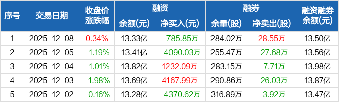 中国银行:融资净偿还785.85万元,融资余额13.33亿元(12-08)