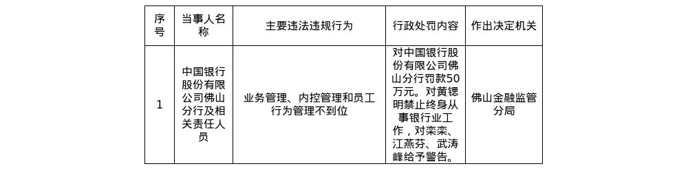 罚单显示,中国银行股份有限公司佛山分行的主要违法违规行为是:业务管理、内控管理和员工行为管理不到位。