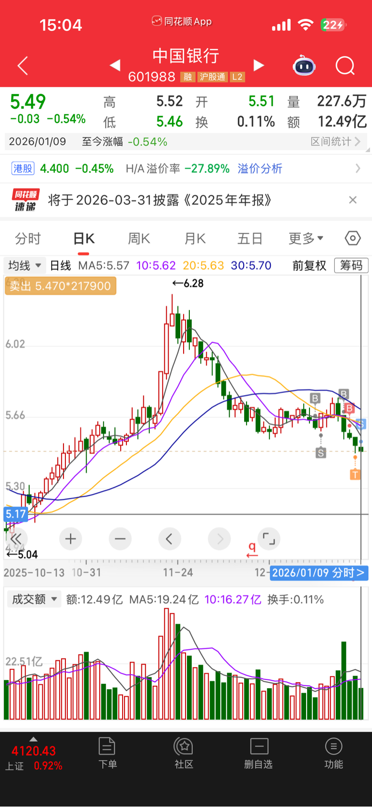$中国银行(SH601988)$ 周一本来想做下防守,5.63买了20万股,补到今天50万股。三个号全割了,亏了将近10万。