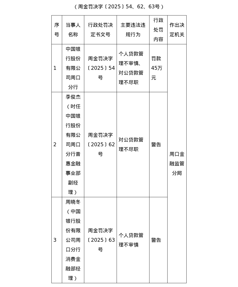 针对上述违法违规行为,国家金融监督管理总局周口监管分局对其罚款45万元;对时任中国银行股份有限公司周口分行普惠金融事业部副经理李俊杰、消费金融部经理周晓冬,分别给予警告。