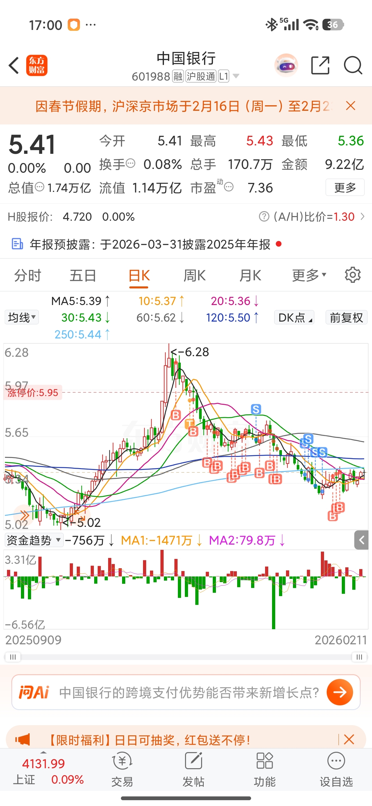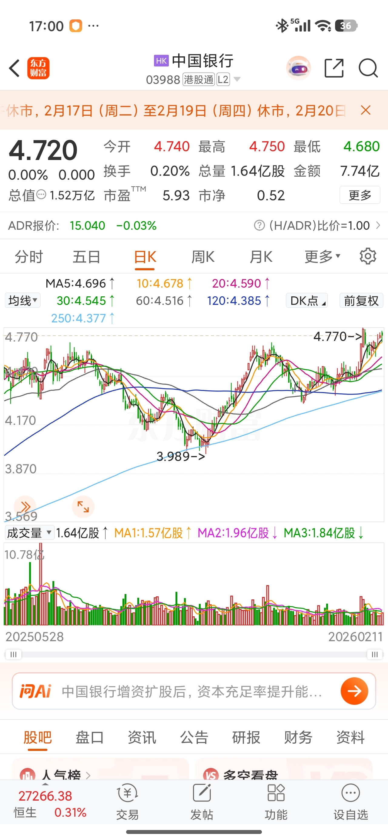 比较下中行A股和港股的走势,真是,港股创新高了,A还会下调吗?