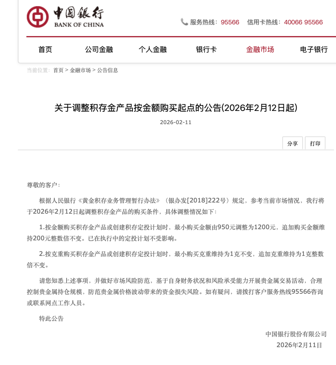中国银行表示,根据人民银行《黄金积存业务管理暂行办法》规定,参考当前市场情况,将于2026年2月12日起调整积存金产品的购买条件,具体调整情况如下: