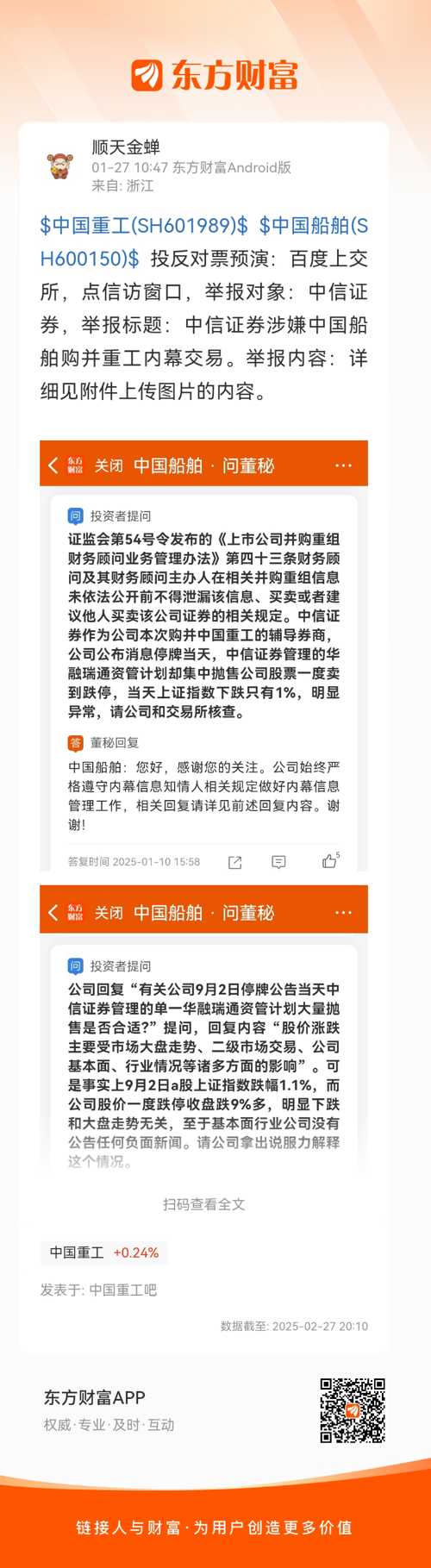 $中国重工(SH601989)$ $中国船舶(SH600150)$ 投反对票预演:百度上交所,点信访窗口,举报对象:中信证券,举报标题:中信证券涉嫌中国船舶购并重工内幕交易。举报内容:详细见附件上传图片的内容。