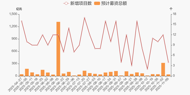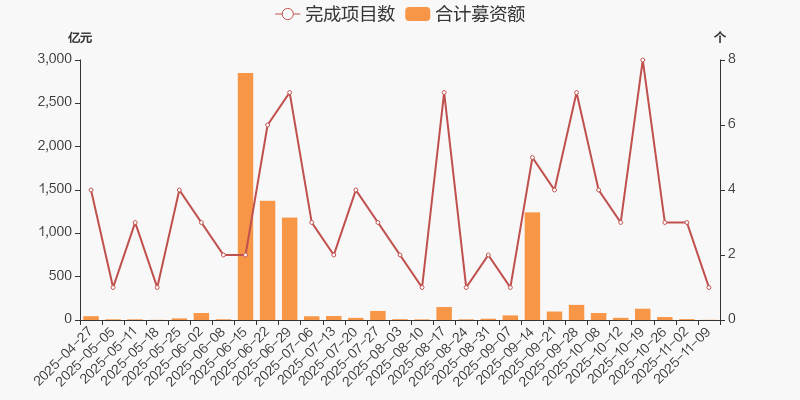 本周(2025/11/02-2025/11/09)共新增4例定增预案,预计募集资金共计39亿元,新增项目数量环比减少8例,预计募资总额环比降低279.6亿。