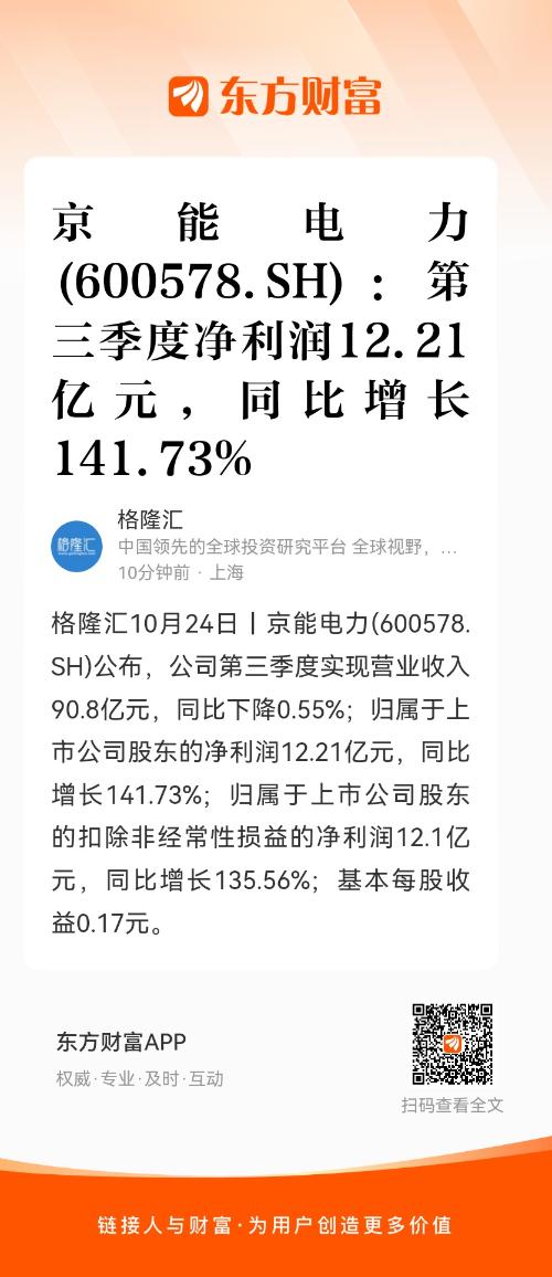 格隆汇10月24日丨京能电力(600578.SH)公布,公司第三季度实现营业收入90.8亿元,同比下降0.55%;归属于上市公司股东的净利润12.21亿元,同比增长141.73%;归属于上市公司股东的扣除非经常性损益的净利润12.1亿元,同比增长135.56%;基本每股收益0.17元。
