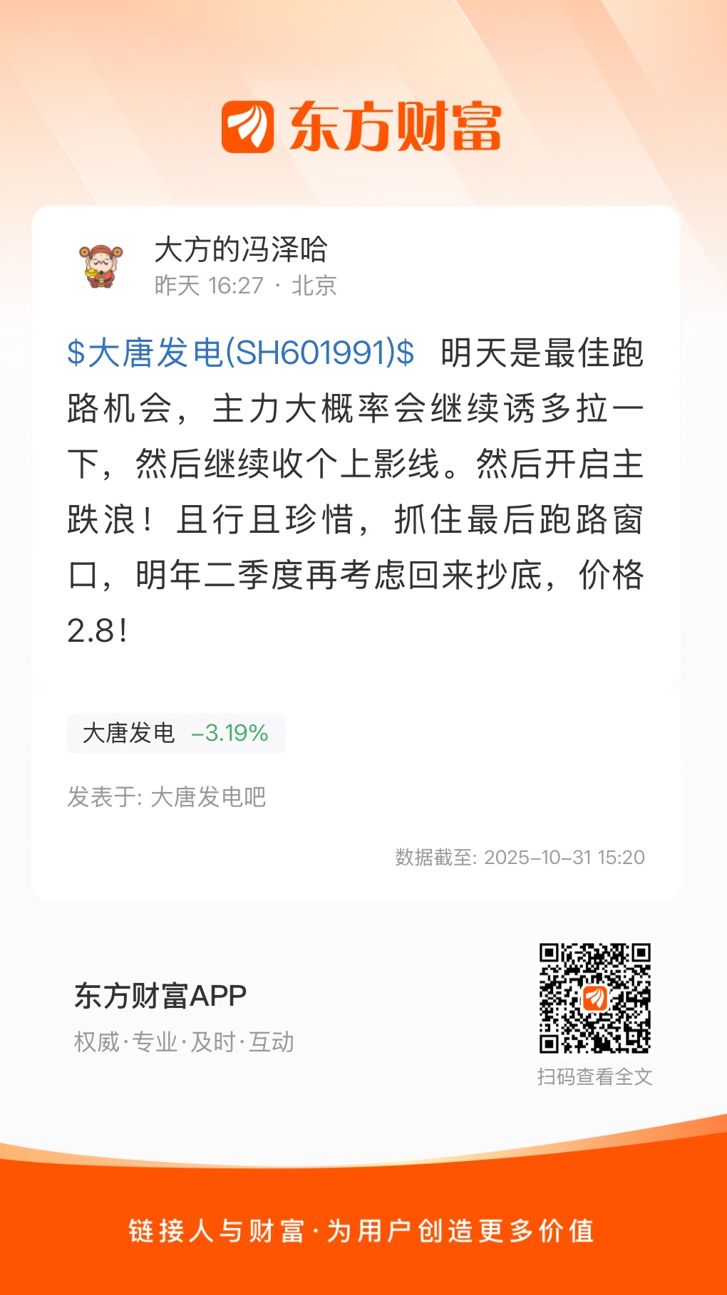 $大唐发电(SH601991)$ 明天是最佳跑路机会,主力大概率会继续诱多拉一下,然后继续收个上影线。然后开启主跌浪!且行且珍惜,抓住最后跑路窗口,明年二季度再考虑回来抄底,价格 2.8!