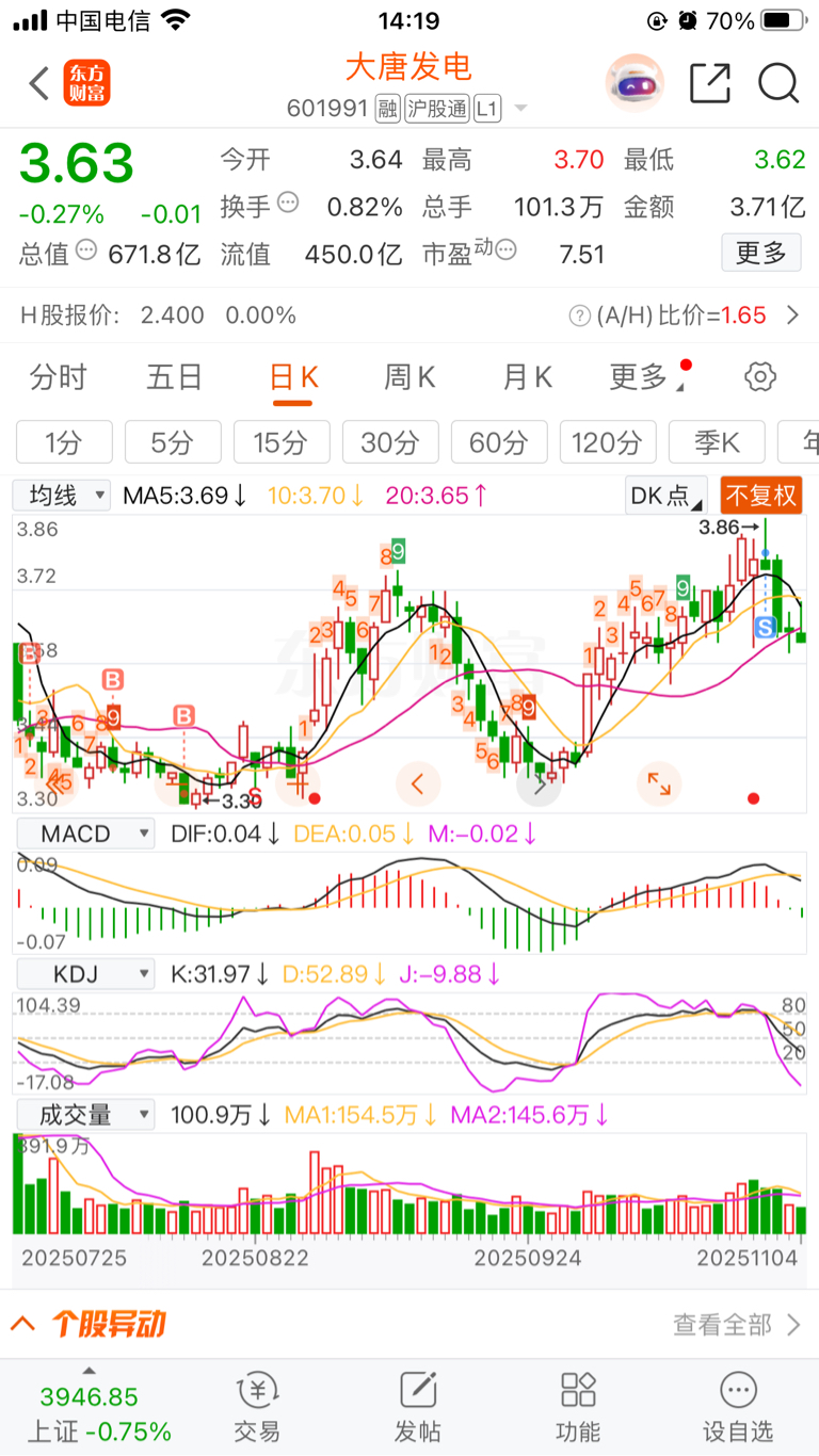 $大唐发电(SH601991)$ 我相信他有一天会大涨的!虽然我清仓了,但留一手插眼,去了科技板块和券商加仓了!