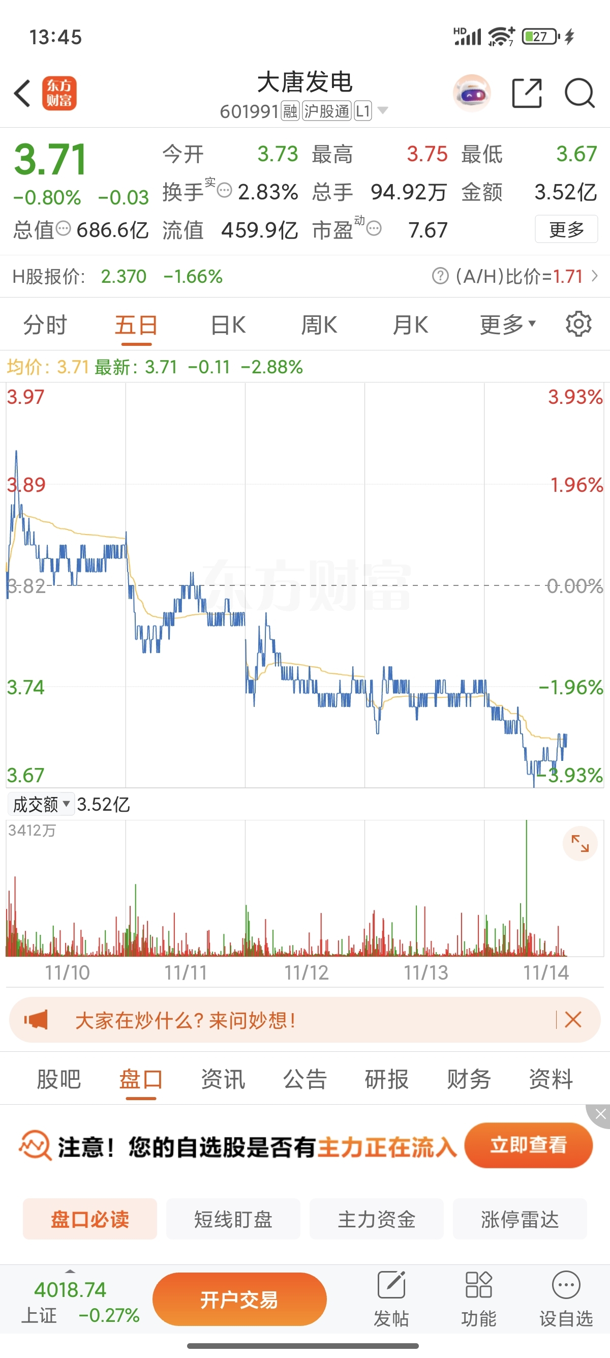 $大唐发电(SH601991)$ 一周跌5天,5天是周末的极限,不是你的极限