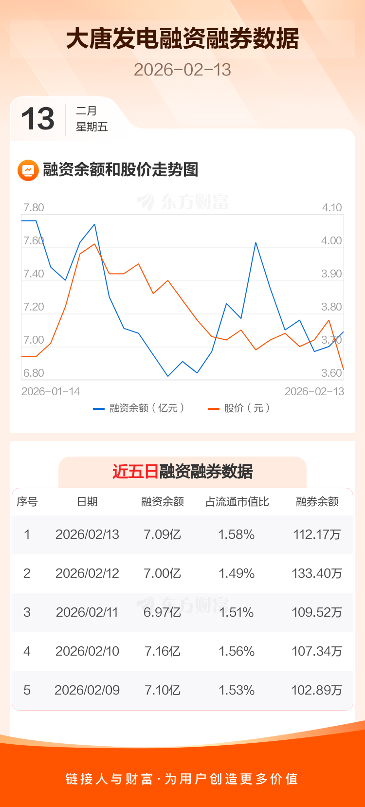 交易所最新数据显示,大唐发电于2026年2月13日获融资买入5936.19万元,融资偿还5012.20万元,当日融资净买入923.98万元。目前,该股融资余额7.09亿,占流通市值比例为1.58%。