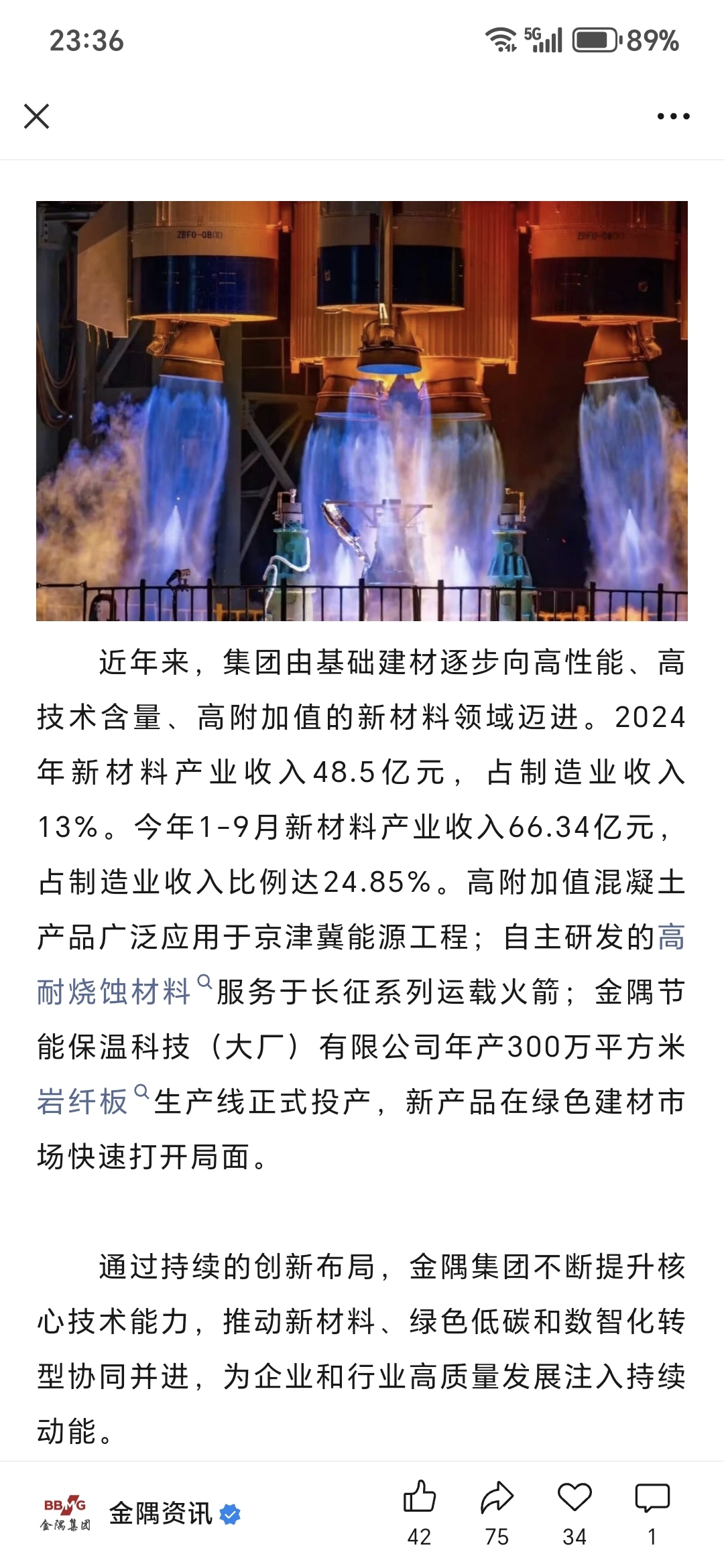 $金隅集团(SH601992)$ 2024年新材料产业收入48.5亿元,占制造业收入13%。今年1-9月新材料产业收入66.34亿元,占制造业收入比例达24.85%。高附加值混凝土产品广泛应用于京津冀能源工程;自主研发的高耐烧蚀材料服务于长征系列运载火箭;金隅节能保温科技(大厂)有限公司年产300万平方米岩纤板生产线正式投产,新产品在绿色建材市场快速打开局面。