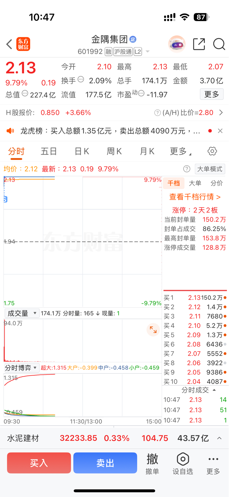 $金隅集团(SH601992)$ 今天会开板么,感觉今天封不住,开盘就卖了