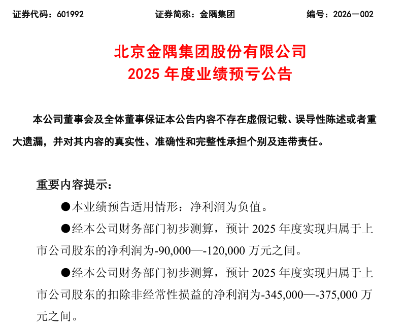 金隅集团2025年净利预亏至少9亿元,建材业务下行致亏损进一步扩大