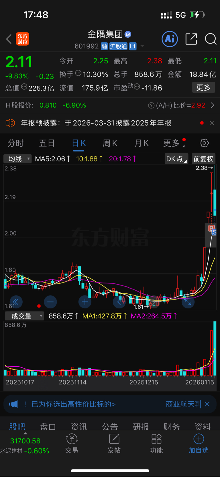 然后下午看资金在尝试回Ai 1点35分挂2.14元全部割掉了