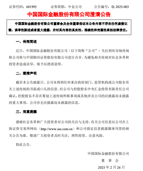 当日,中金公司发布澄清公告称,经中金公司与控股股东中央汇金投资有限责任公司确认,控股股东不存在筹划上述传闻所称事项或其他涉及公司的应披露而未披露的重大事项,公司亦无应披露而未披露的信息。