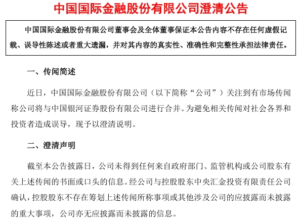 中金公司公告,公司关注到有市场传闻称公司将与中国银河证券股份有限公司进行合并。为避免相关传闻对社会各界和投资者造成误导,现予以澄清说明。截至本公告披露日,公司未得到任何来自政府部门、监管机构或公司股东有关上述传闻的书面或口头的信息。经公司与控股股东中央汇金投资有限责任公司确认,控股股东不存在筹划上述传闻所称事项或其他涉及公司的应披露而未披露的重大事项,公司亦无应披露而未披露的信息。