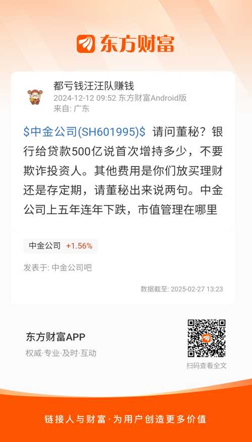 $中金公司(SH601995)$ 请问董秘?银行给贷款500亿说首次增持多少,不要欺诈投资人。其他费用是你们放买理财还是存定期,请董秘出来说两句。中金公司上五年连年下跌,市值管理在哪里