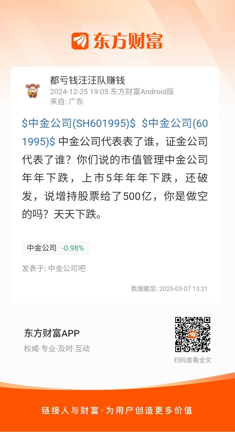 $中金公司(SH601995)$ $中金公司(601995)$ 中金公司代表表了谁,证金公司代表了谁?你们说的市值管理中金公司年年下跌,上市5年年年下跌,还破发,说增持股票给了500亿,你是做空的吗?天天下跌。