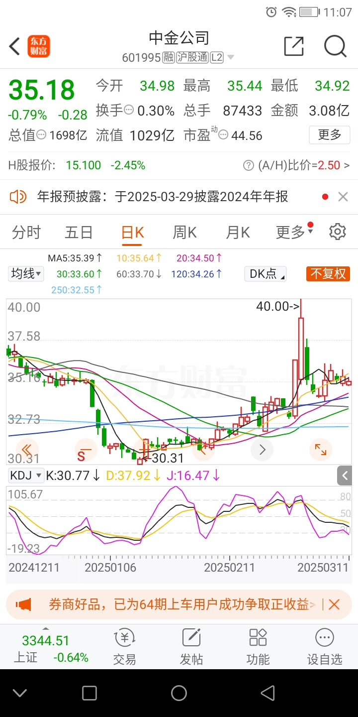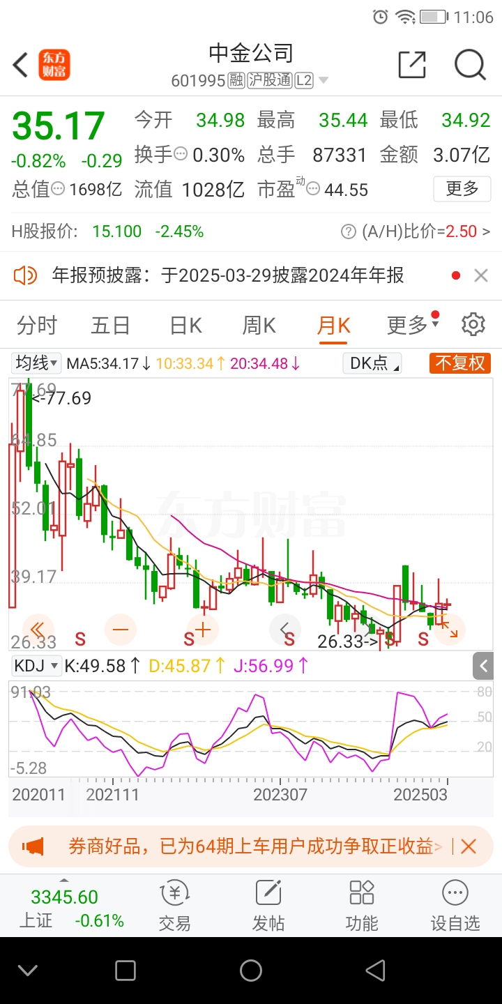 日线适合短线,月线适合中长线!综合看中金公司股价目前处于上市以来低位,日线也有上