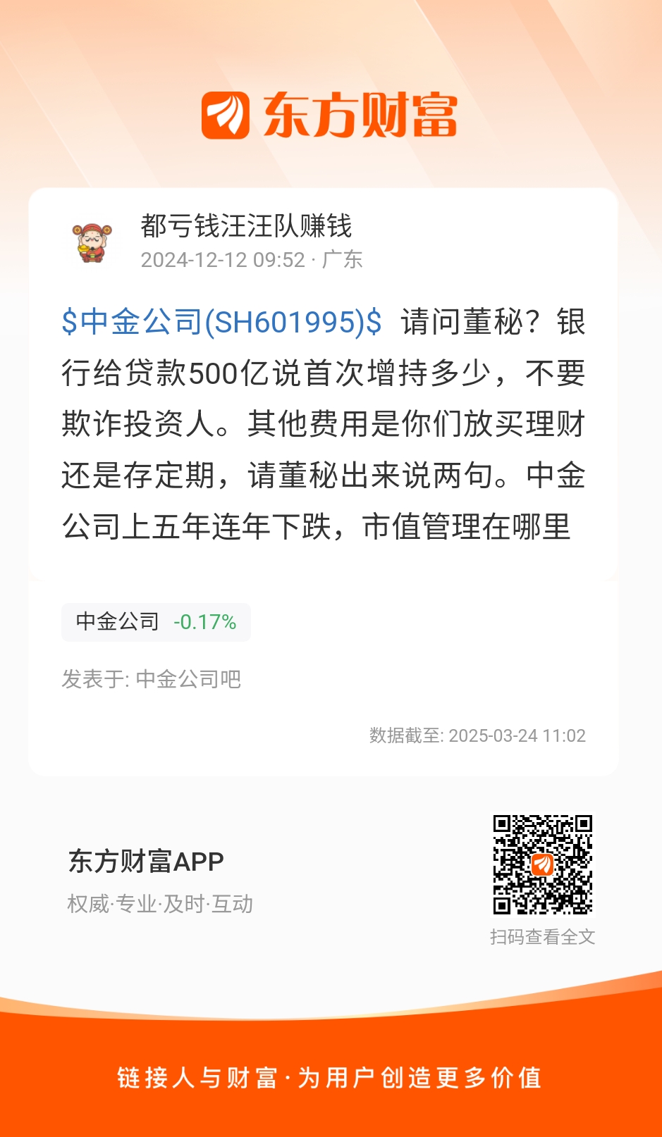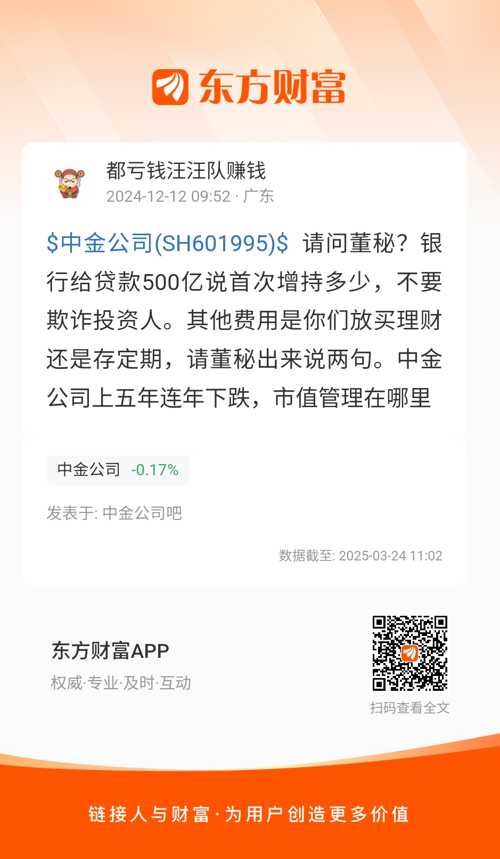 $中金公司(SH601995)$  请问董秘?银行给贷款500亿说首次增持多少,不要欺诈投资人。其他费用是你们放买理财还是存定期,请董秘出来说两句。中金公司上五年连年下跌,市值管理在哪里