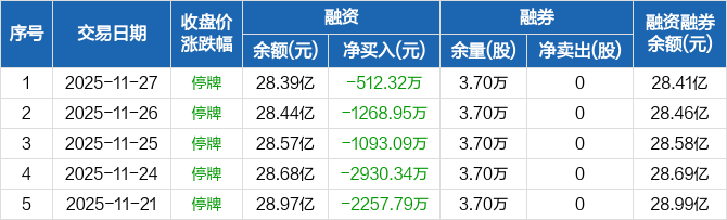 融资方面,当日融资买入0元,融资偿还512.32万元,融资净偿还512.32万元,连续6日净偿还累计1.02亿元。融券方面,融券卖出0股,融券偿还0股,融券余量3.7万股,融券余额129.09万元。融资融券余额合计28.41亿元。