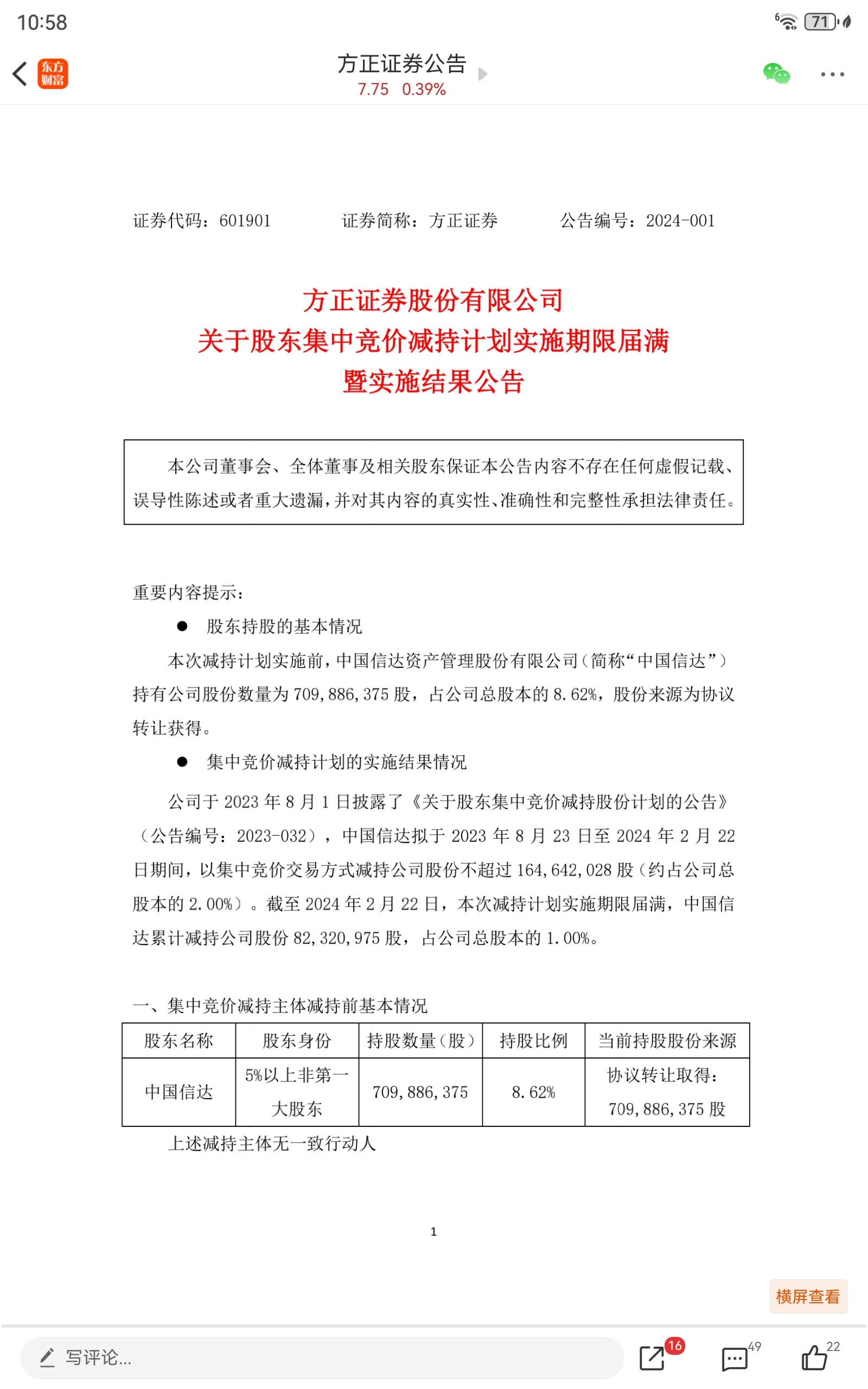 方证证券公司于2023年8月1日披露了《关于股东集中竞价减持股份计划的公告》(公告编号:2023-032),中国信达拟于2023年8月23日至2024年2月22日期间,以集中竞价交易方式减持公司股份不超过164,642,028股(约占公司总股本的2.00%)。截至2024年2月22日,本次减持计划实施期限届满,中国信达累计减持公司股份82,320,975股,占公司总股本的1.00%。