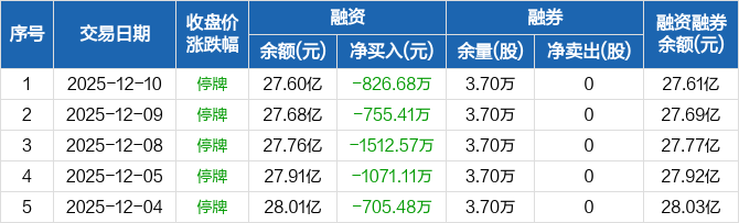 融资方面,当日融资买入0元,融资偿还826.68万元,融资净偿还826.68万元,连续15日净偿还累计1.81亿元。融券方面,融券卖出0股,融券偿还0股,融券余量3.7万股,融券余额129.09万元。融资融券余额合计27.61亿元。