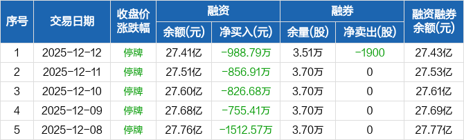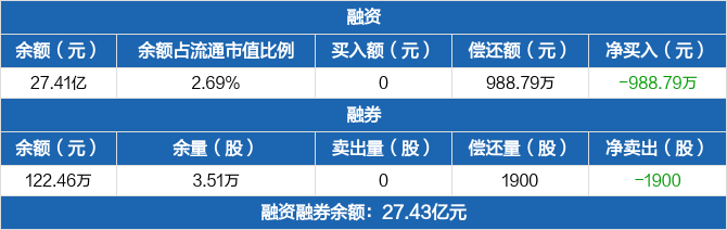 融资方面,当日融资买入0元,融资偿还988.79万元,融资净偿还988.79万元,连续17日净偿还累计2亿元。融券方面,融券卖出0股,融券偿还1900股,融券余量3.51万股,融券余额122.46万元。融资融券余额合计27.43亿元。