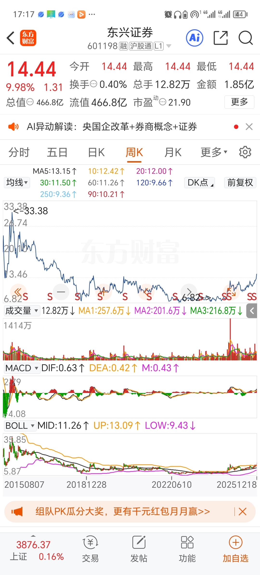 东兴股价是七八年来的最高点,合并完,东兴股东基本随便砸!中金给东兴做陪衬了!
