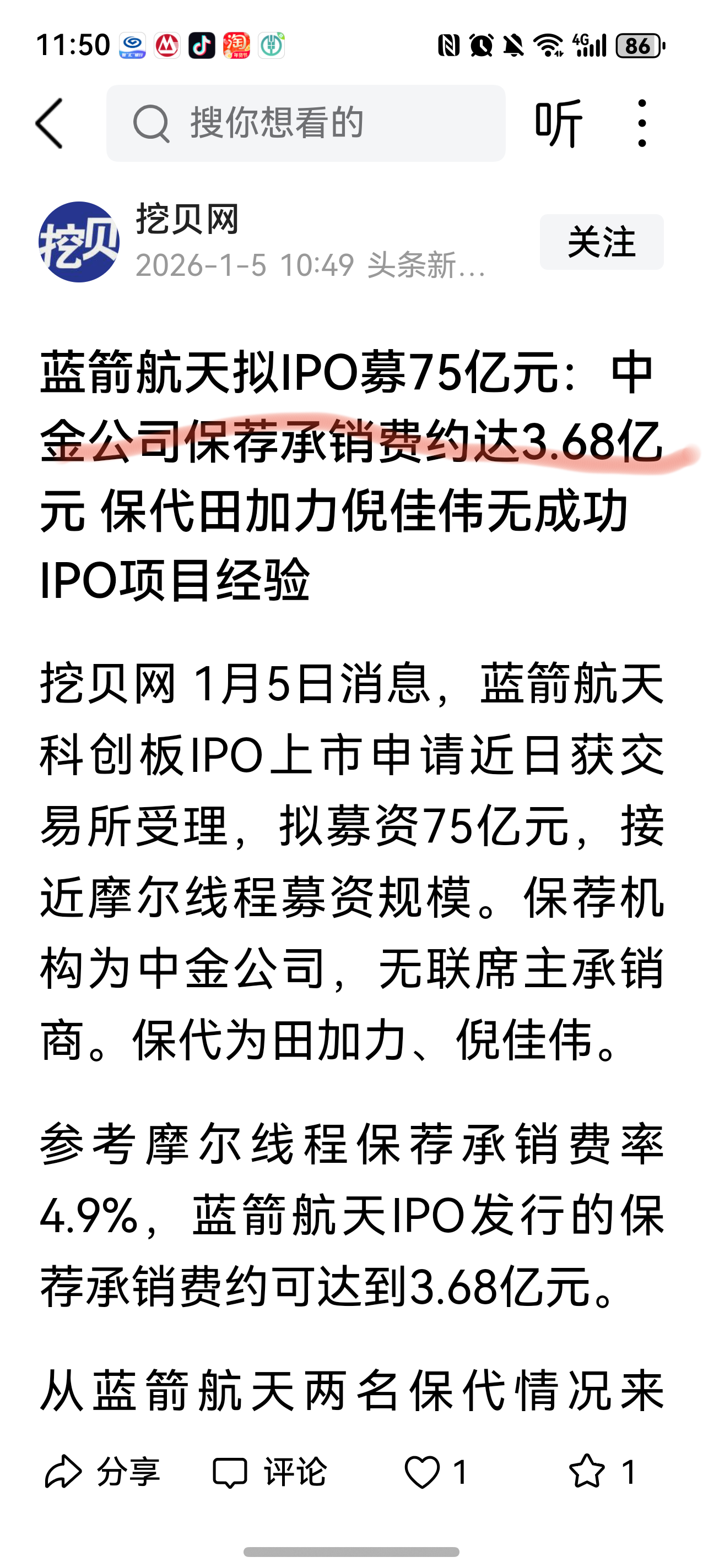 蓝箭航天拟IPO募75亿元:中金公司保荐承销费约达3.68亿元