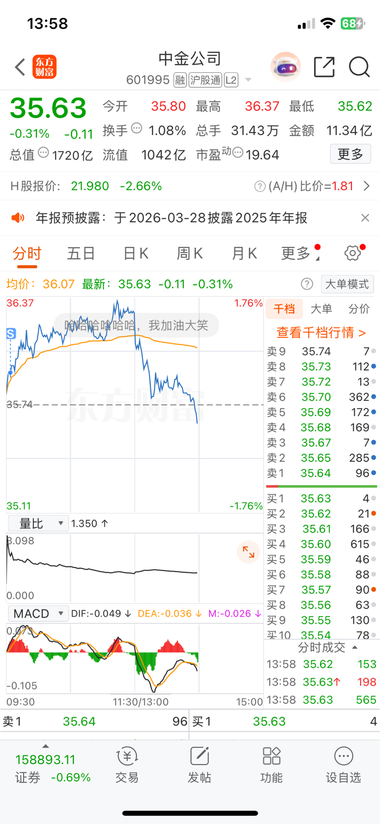 $中金公司(SH601995)$ 还好管住了手,早上没有又买进去