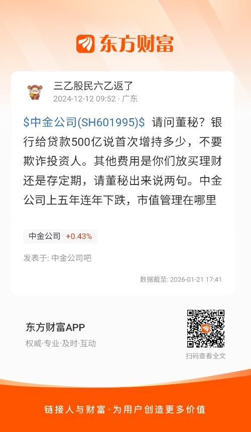 $中金公司(SH601995)$ 请问董秘?银行给贷款500亿说首次增持多少,不要欺诈投资人。其他费用是你们放买理财还是存定期,请董秘出来说两句。中金公司上五年连年下跌,市值管理在哪里