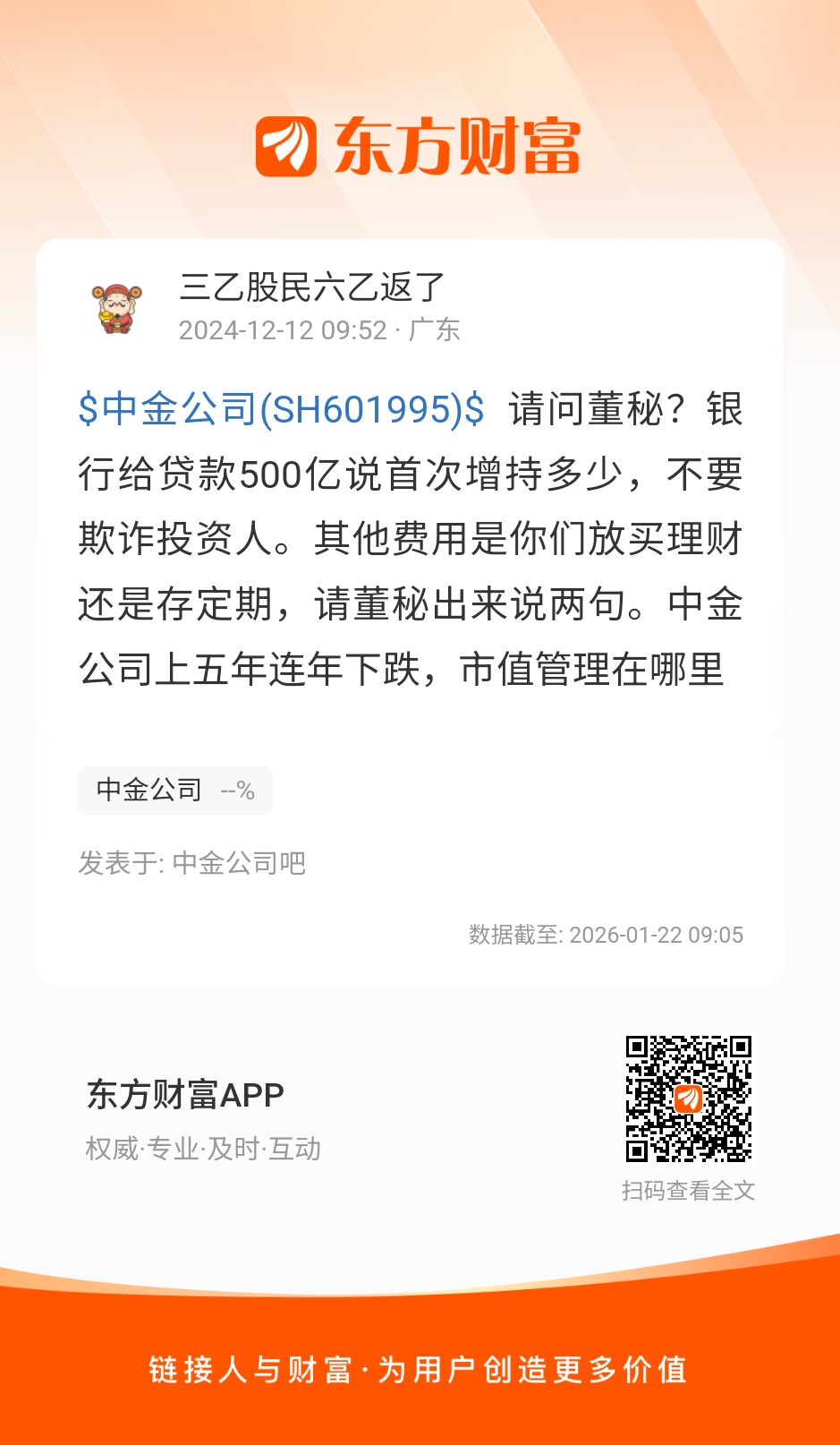 $中金公司(SH601995)$ 请问董秘?银行给贷款500亿说首次增持多少,不要欺诈投资人。其他费用是你们放买理财还是存定期,请董秘出来说两句。中金公司上五年连年下跌,市值管理在哪里