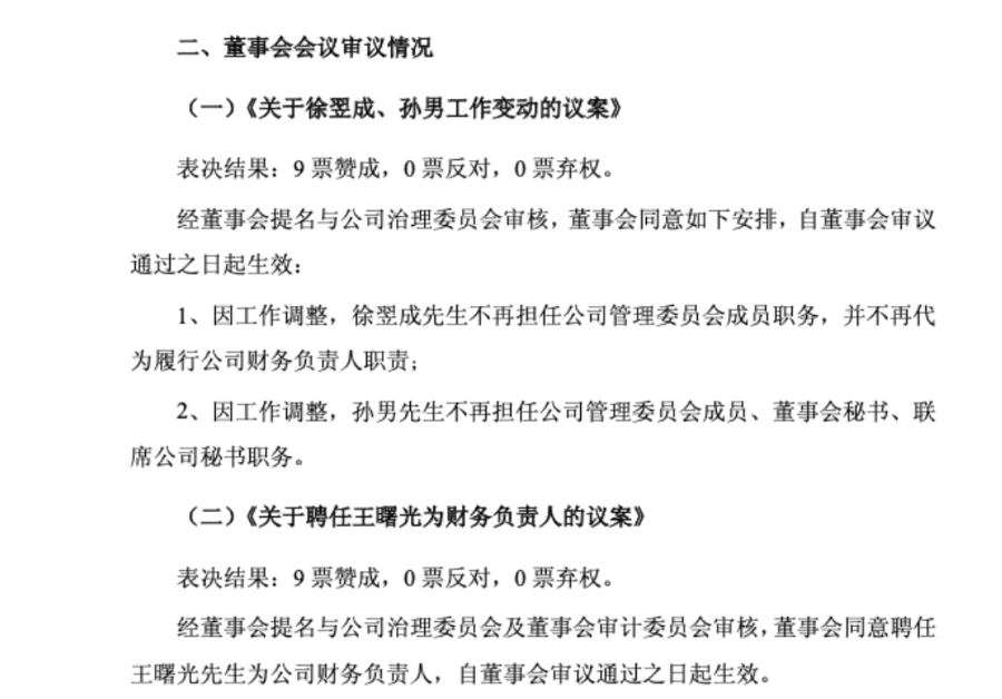 原管理委员会成员徐翌成、孙男因工作调整分别不再代行财务负责人职责及董事会秘书职务。