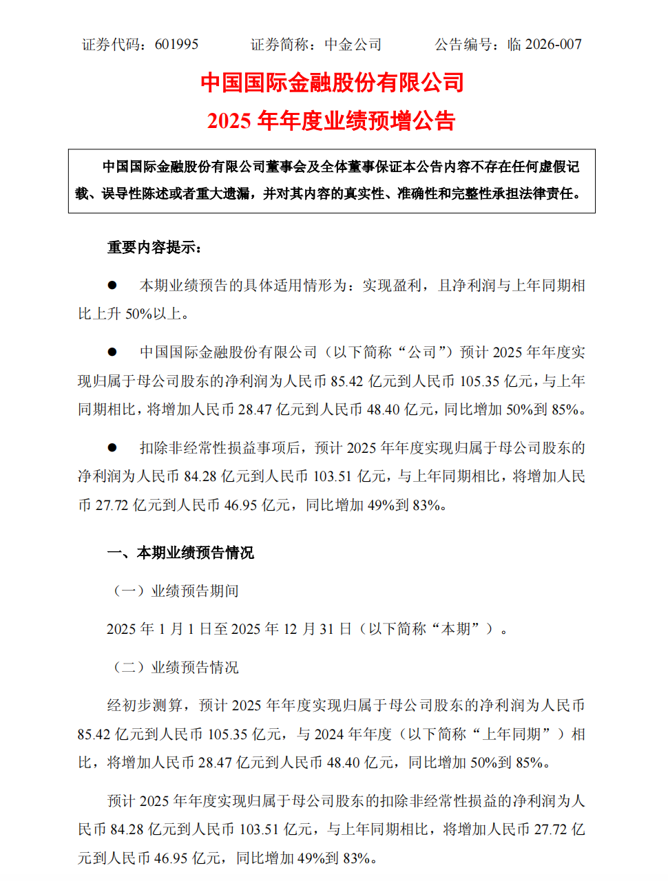 央广网北京1月30日消息(记者樊瑞)1月30日盘后,中金公司(601995.SH)披露2025年年度业绩预增预告。