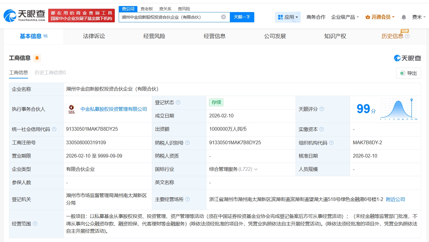 南方财经2月11日电,天眼查App显示,近日,湖州中金启新股权投资合伙企业(有限合伙)成立,执行事务合伙人为中金私募股权投资管理有限公司,出资额100亿人民币,经营范围为以私募基金从事股权投资、投资管理、资产管理等活动,由湖州市产业基金投资有限公司、湖州市创新创业投资有限公司、湖州市交通投资集团有限公司等共同出资。