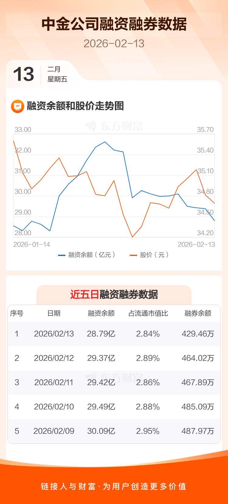 交易所最新数据显示,中金公司于2026年2月13日获融资买入6871.85万元,融资偿还1.27亿元,当日融资净偿还5827.1万元。目前,该股融资余额28.79亿,占流通市值比例为2.84%。