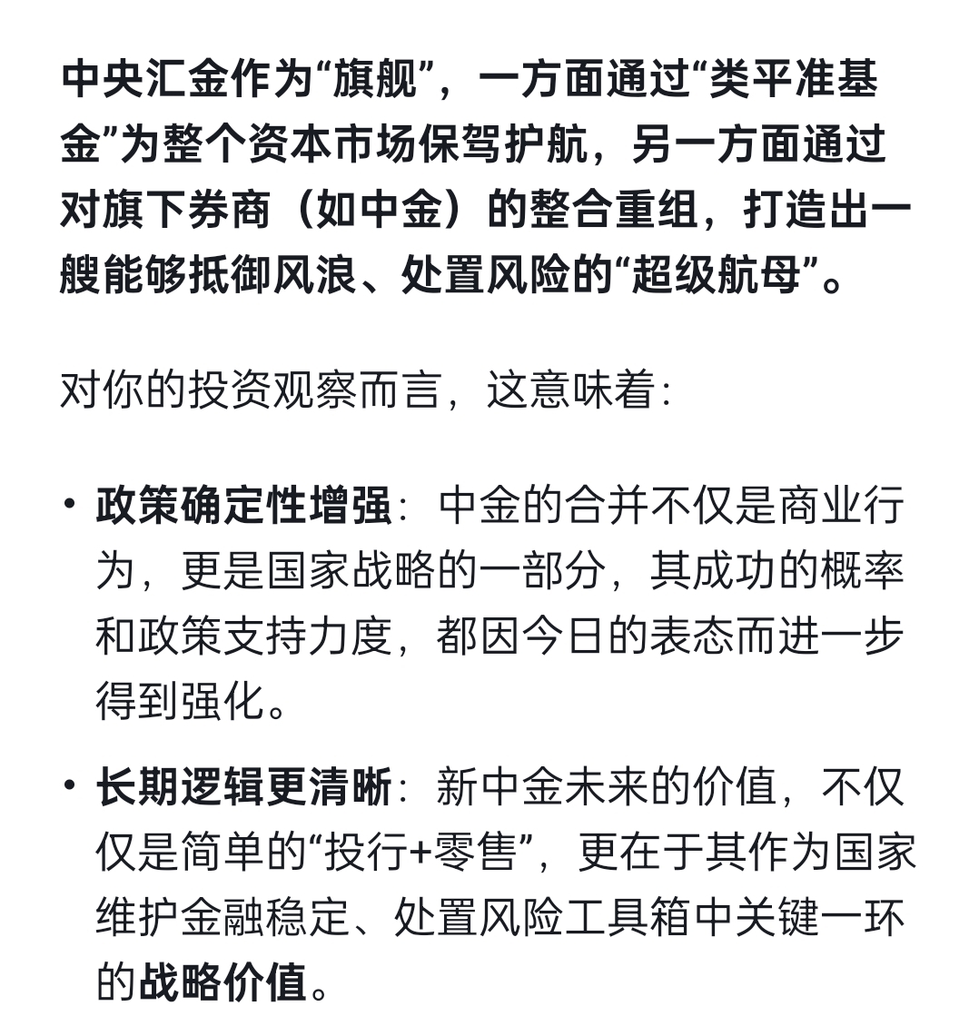 汇金系最近操作是双线战略!其一是类平准基金,对外维稳。目前是通过增持各类ETF提供流动性、激活资本市场;其二是旗下券商整合成航母级券商,对内强身,提升自身抗风险能力和市场竞争力。这是国家战略。
