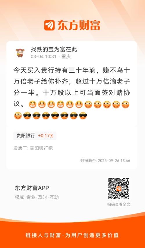今天买入贵行持有三十年滴,赚不鸟十万倍老子给你补齐,超过十万倍滴老子分一半。十万股以上可当面签对赌协议。