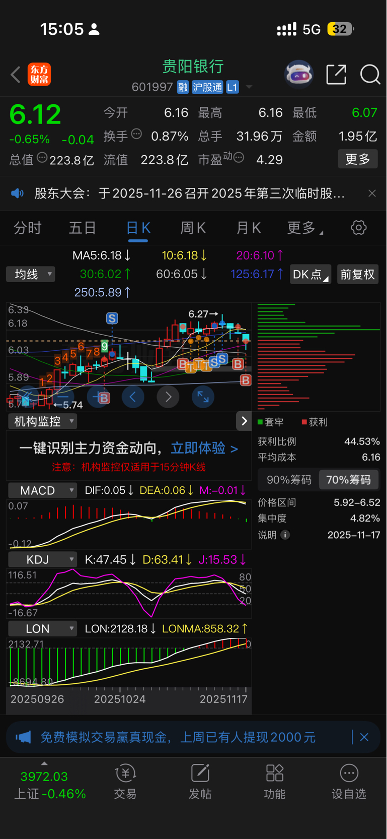$贵阳银行(SH601997)$ 买入60分钟调整完成,等6.37-6.4