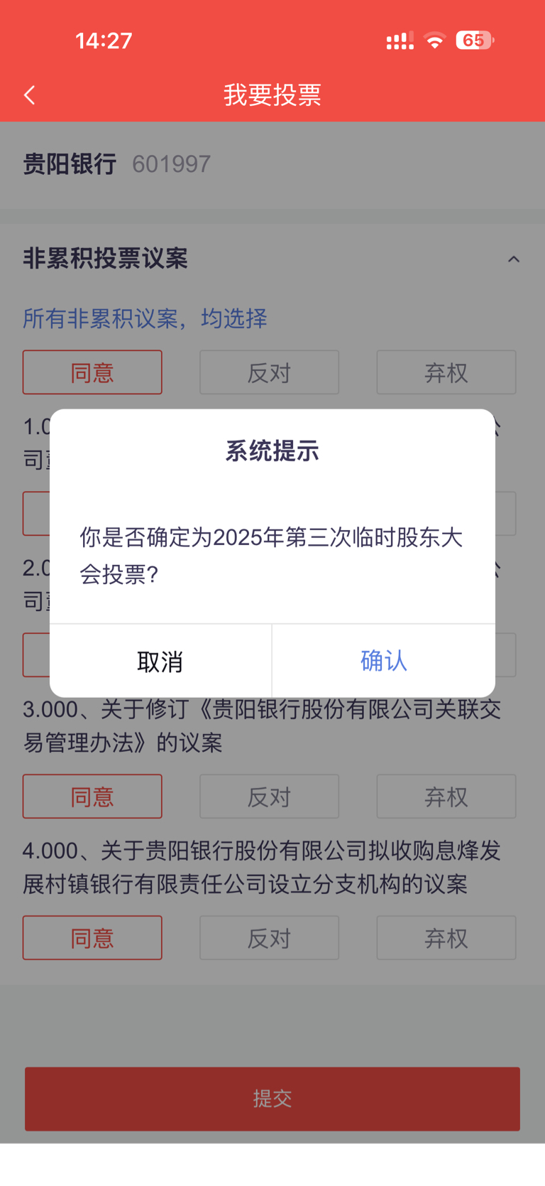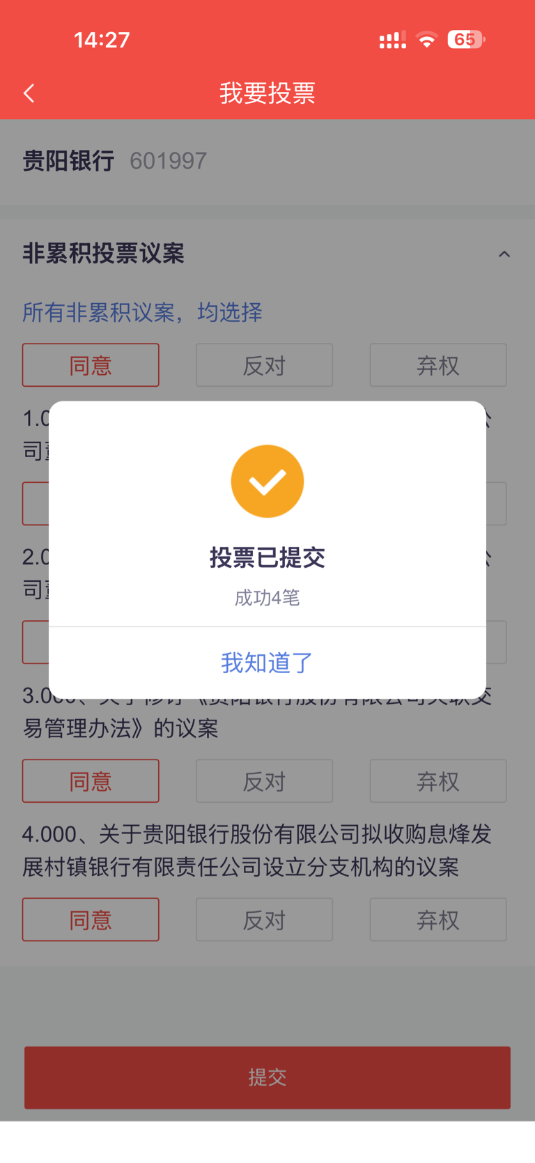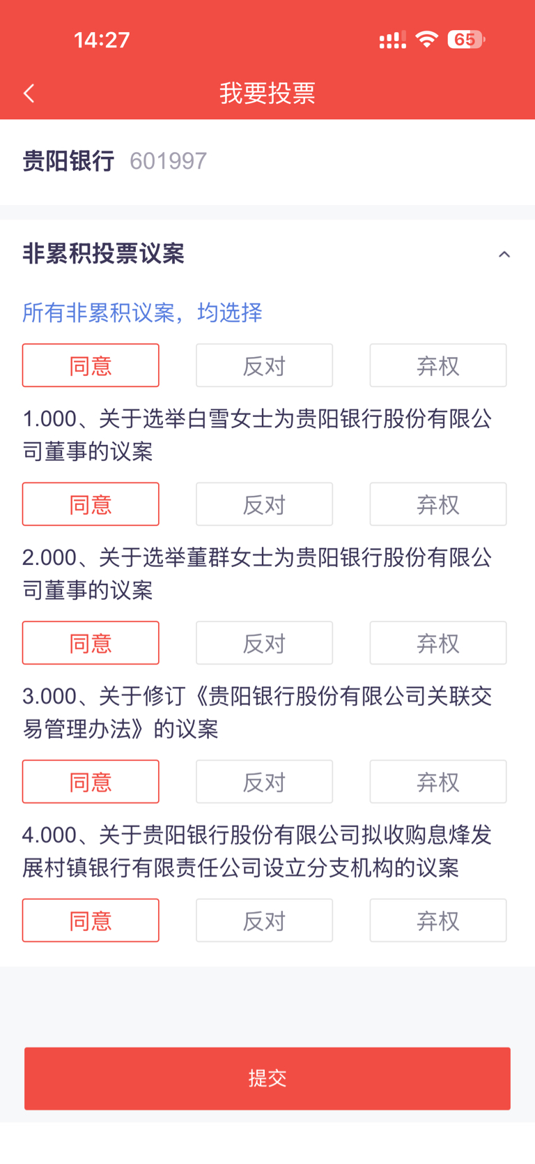 己投全部赞成票!坚持拥护贵阳银行董事会决策!
