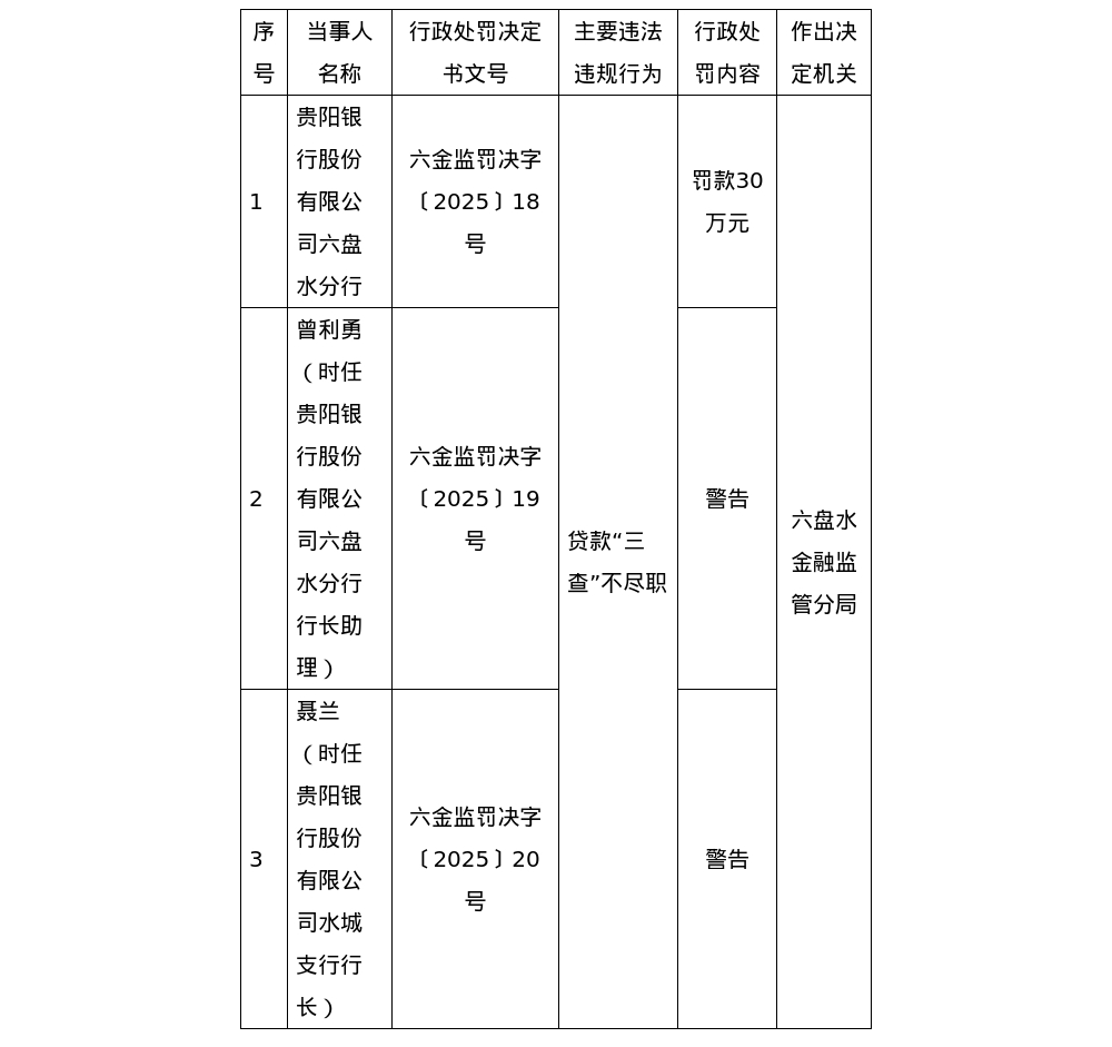 贵阳银行六盘水分行被罚30万,涉贷款“三查”不尽职