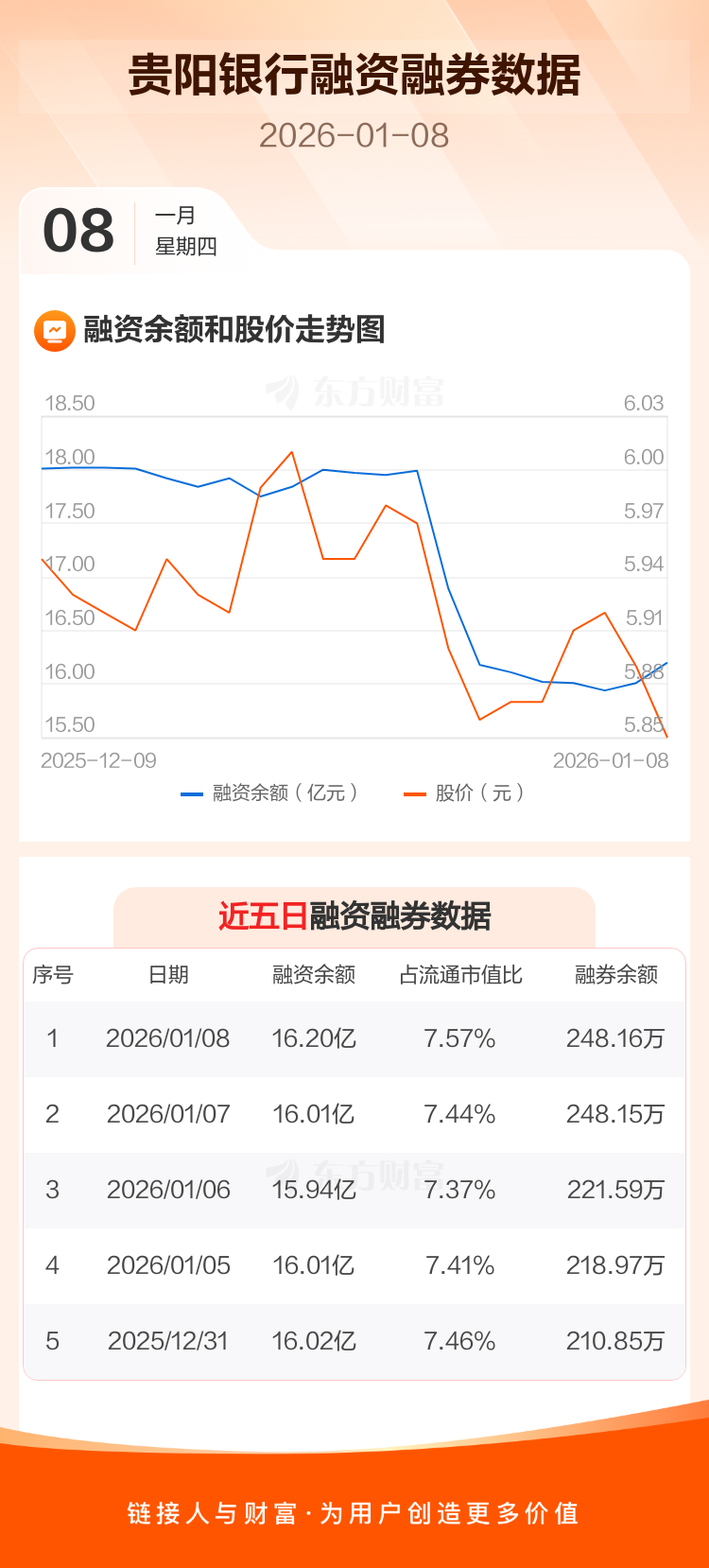 交易所最新数据显示,贵阳银行于2026年1月8日获融资买入3065.90万元,融资偿还1249.78万元,当日融资净买入1816.12万元。目前,该股融资余额16.20亿,占流通市值比例为7.57%。