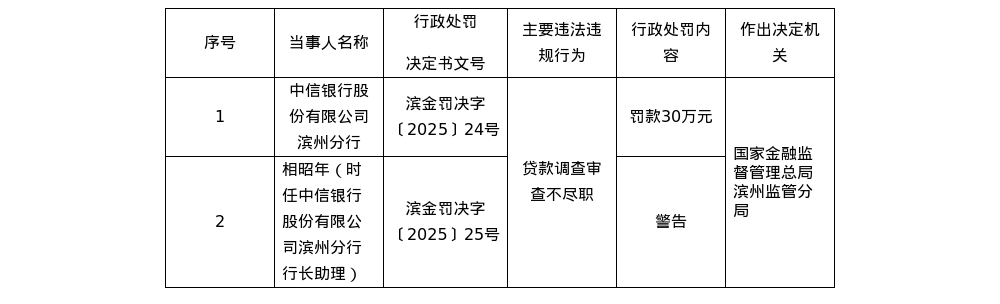中信银行滨州分行被罚30万 涉贷款调查审查不尽职