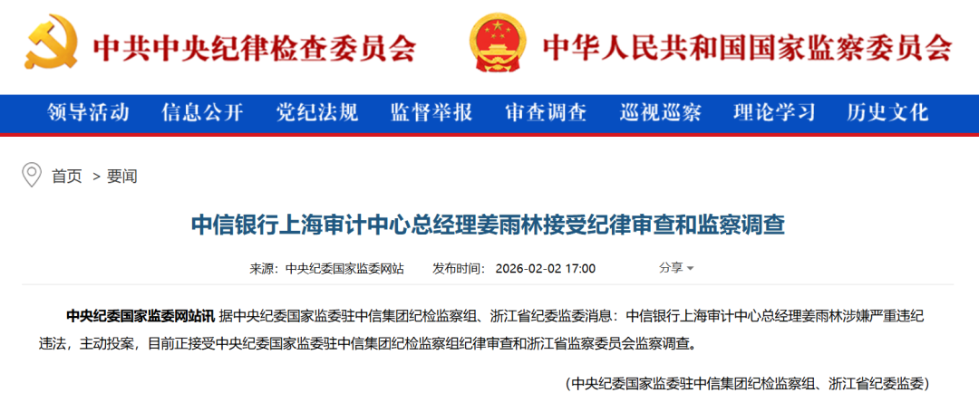 2月2日,中央纪委国家监委官网通报:中信银行上海审计中心总经理姜雨林涉嫌严重违纪违法,主动投案,目前正接受中央纪委国家监委驻中信集团纪检监察组纪律审查和浙江省监察委员会监察调查。