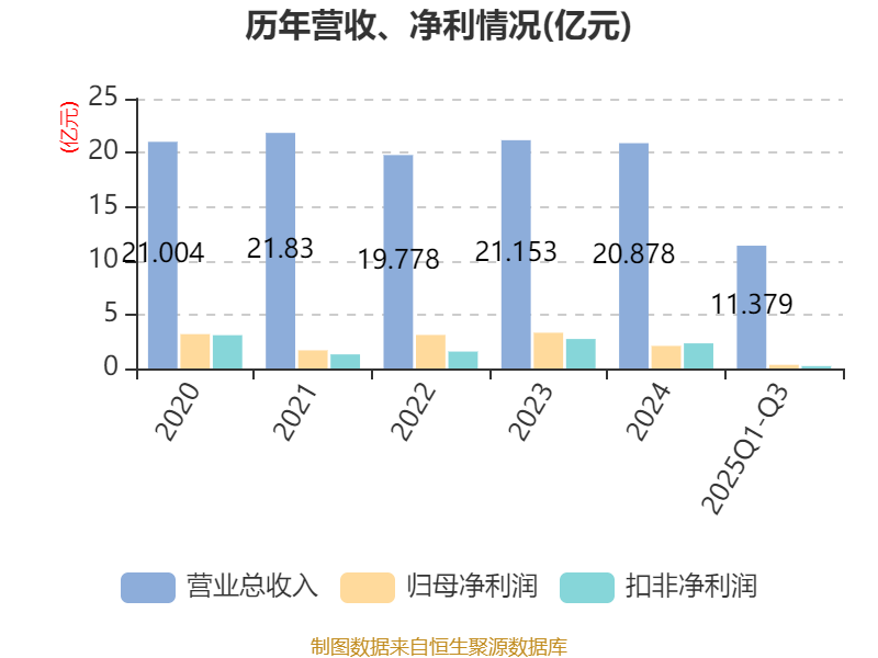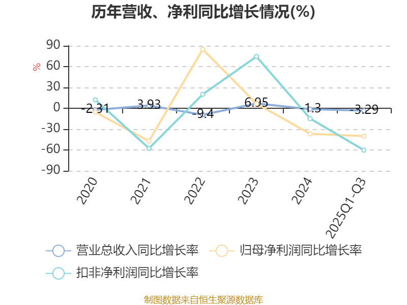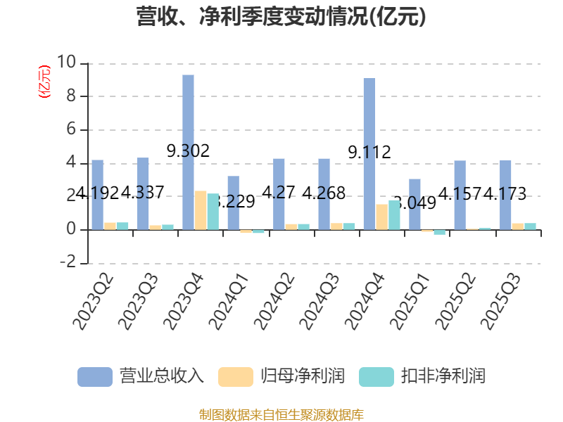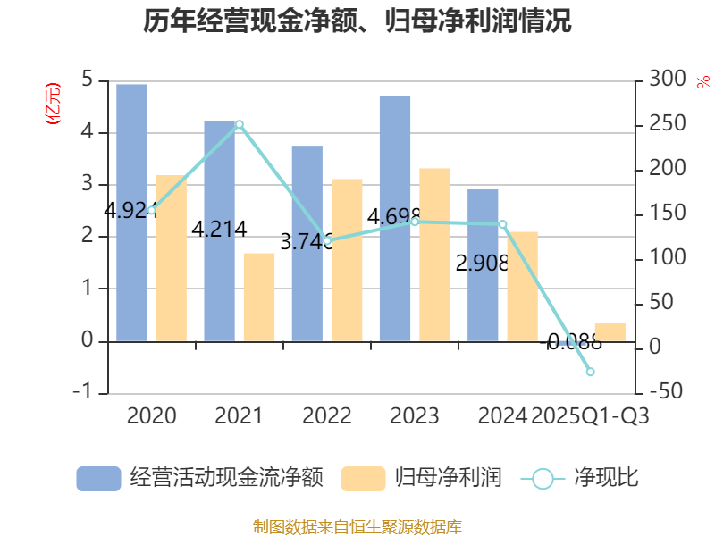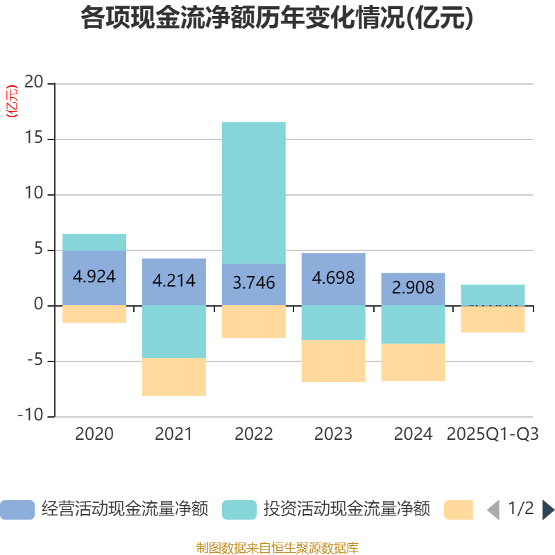 2025年前三季度,公司经营活动现金流净额为-880.14万元,同比增加1.05亿元;筹资活动现金流净额-2.37亿元,同比增加5064万元;投资活动现金流净额1.85亿元,上年同期为-4.65亿元。