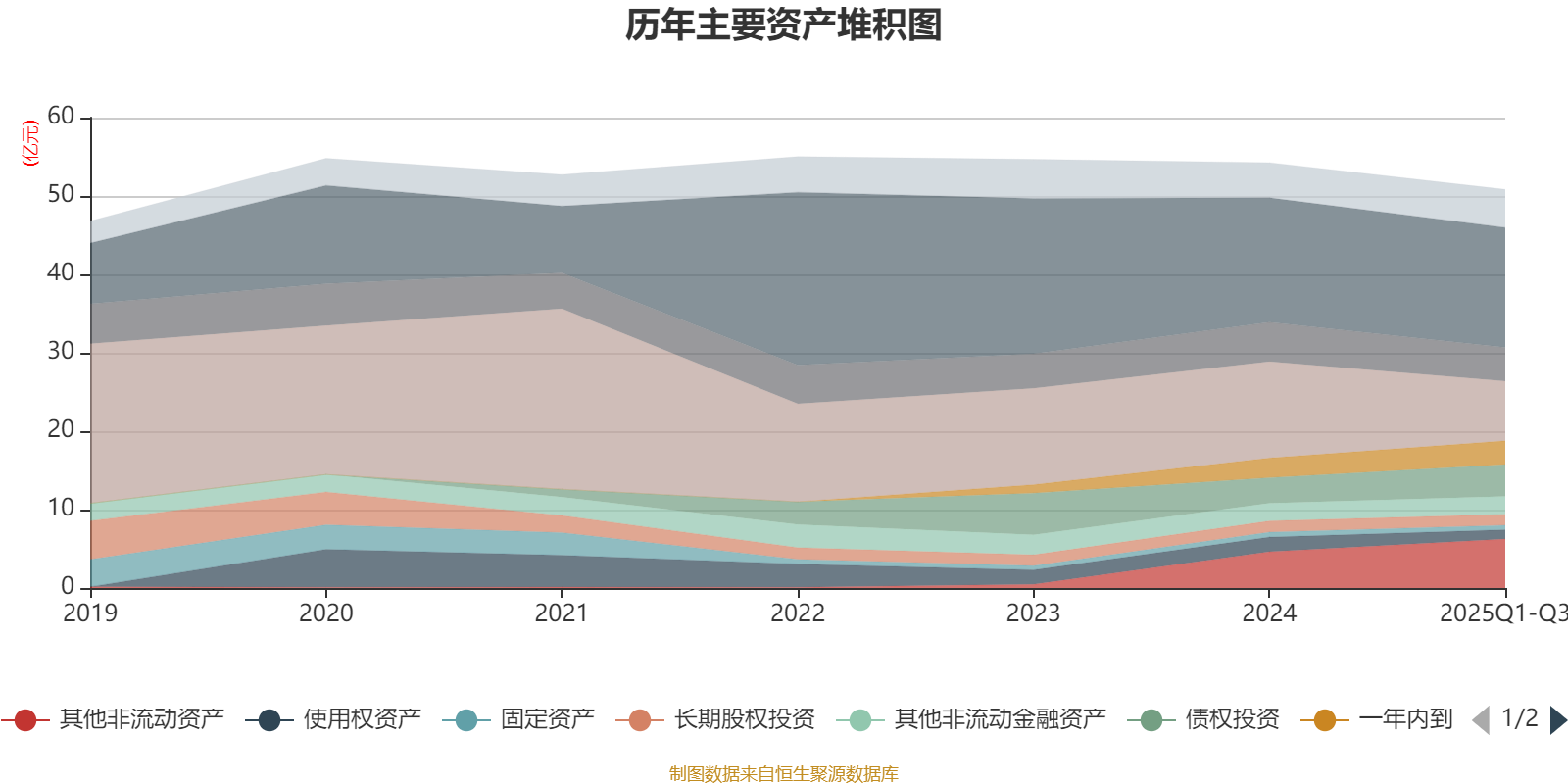 资产重大变化方面,截至2025年三季度末,公司交易性金融资产合计较上年末减少38.21%,占公司总资产比重下降7.72个百分点;其他非流动资产较上年末增加34.76%,占公司总资产比重上升3.74个百分点;债权投资较上年末增加24.87%,占公司总资产比重上升1.99个百分点;一年内到期的非流动资产较上年末增加21.34%,占公司总资产比重上升1.36个百分点。