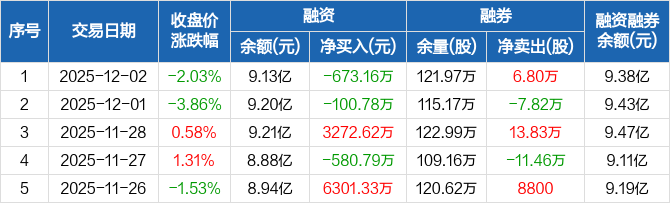 人民网融资融券信息显示,2025年12月2日融资净偿还673.16万元;融资余额9.13亿元,较前一日下降0.73%。