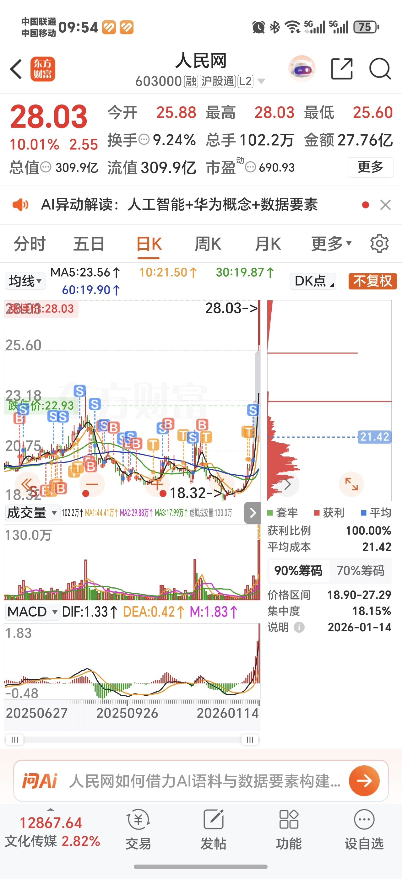 $人民网(SH603000)$ 做了这么久的T,成功在上周五把自己T飞了