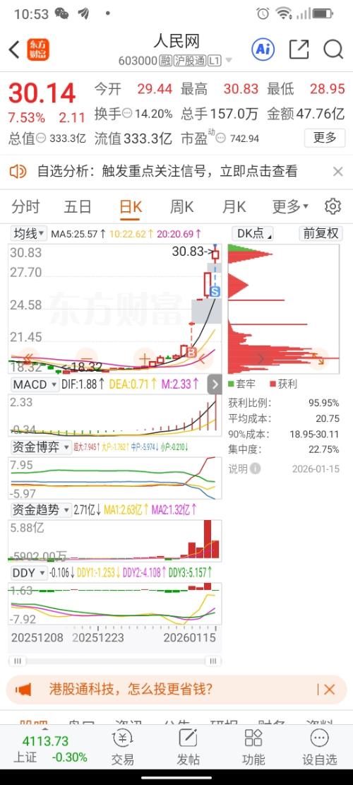 套了两年了,涨太高了,有盈利了,先出一半再说,不至于太紧张,毕竟都是满仓人民网的
