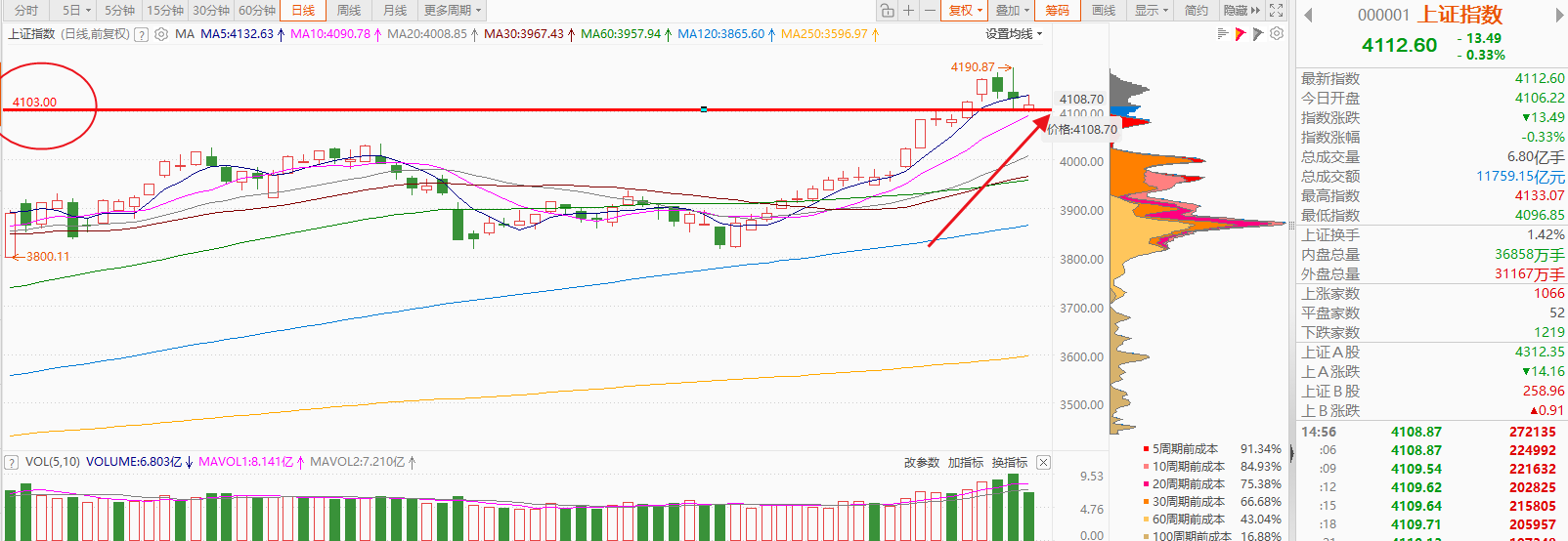 昨天大盘最低探到4096.85点,刚好踩线反弹,说明4103点这个支撑位确实有资金承接,是当前市场的“情绪底线”,今天大家开盘第一件事,就盯着这个位置!
